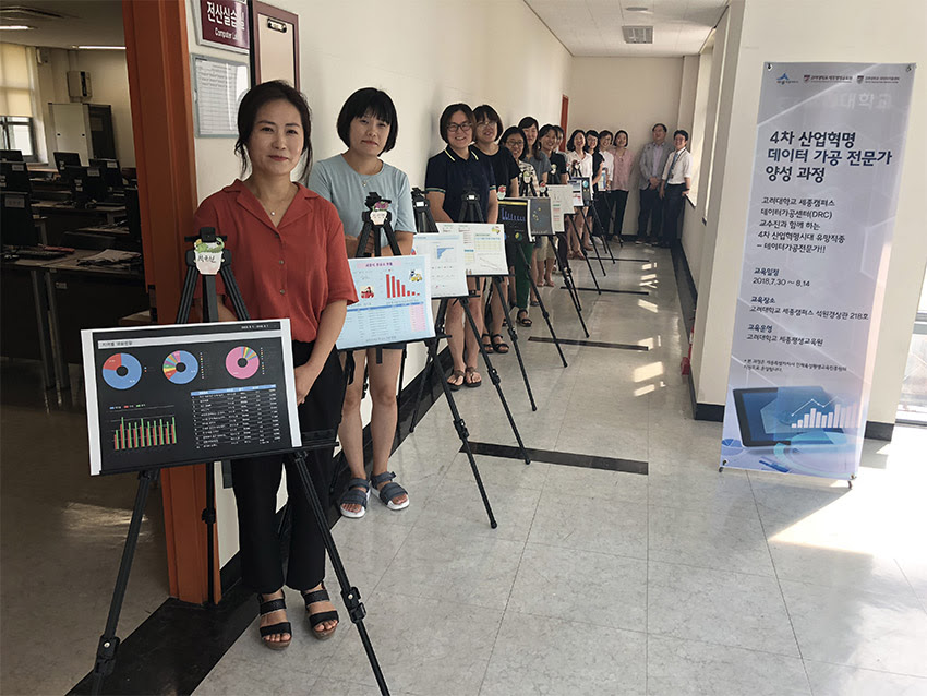 그 일환으로 고용노동부 '4차산업혁명 선도인력 양성훈련' 사업을 수주하여 진행하는 한편, 지난 여름에는 세종시여성새로일하기센터 및 본교의 데이터가공센터와 힘을 모아 세종시 경력단절여성 대상으로 한 '4차 산업혁명 데이터 가공 전문가 양성 과정'을 세종시의 지원을 받아 수행하였습니다.